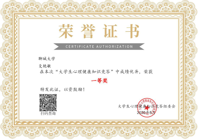 为提高心理健康水平,传播心理健康理念,2020年5月,环境与规划学院学生殳艳敏参加了大学生心理健康知识竞赛,获得了一等奖,在竞赛中不断加强了心理素质建设,树立了积极健康的心理价值取向。