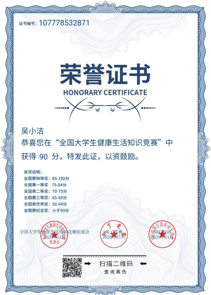 为促进科学知识的传播和普及,增强对健康的重视程度,2020年11月,环境与规划学院学生吴小洁参加了全国大学生健康生活知识竞赛,获得了全国赛特等奖,使其加深了对健康生活方式的认识,形成了良好生活的习惯。